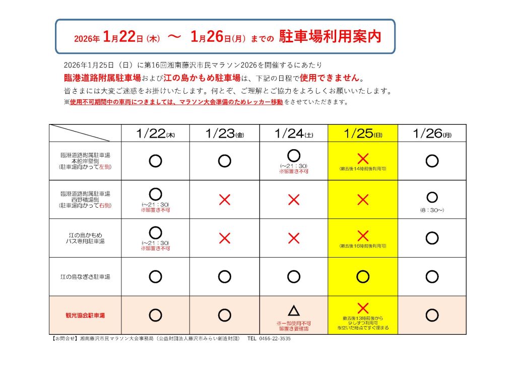 湘南藤沢市民マラソン2026開催にともない、1/24(土)・25(日)の2日間は駐車可能台数が大幅に少なくなります。ご来島の際は公共交通機関のご利用をおすすめいたします。歩道も混雑するのでご注意ください。